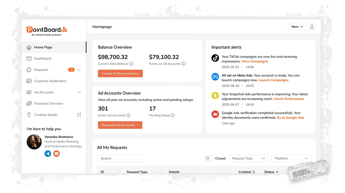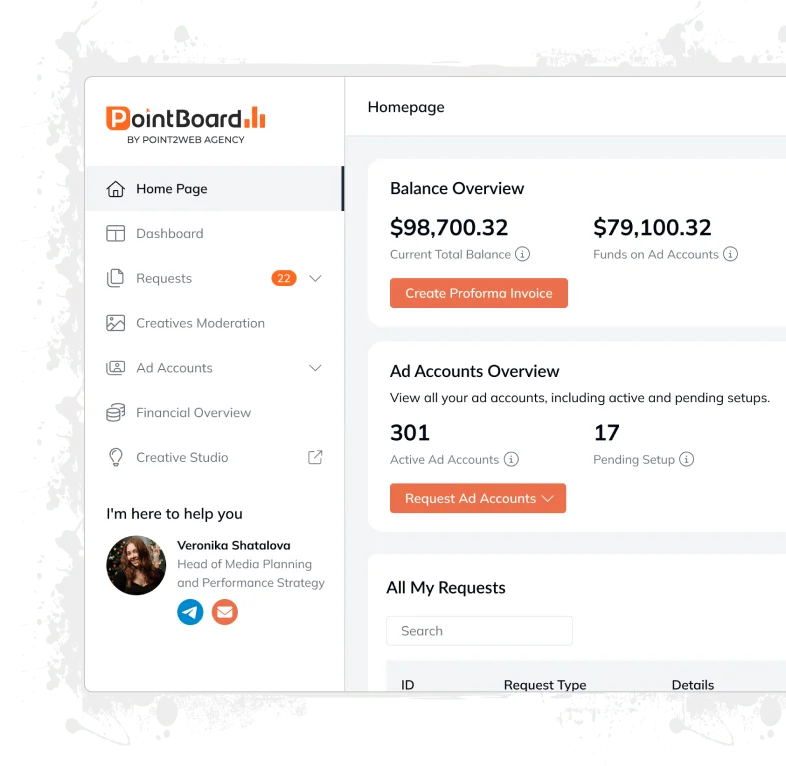 PointBoard is your all-in-one platform for seamless ad account control, budget management, compliance checks, and real-time performance insights. Save time, cut manual effort, and focus on growth